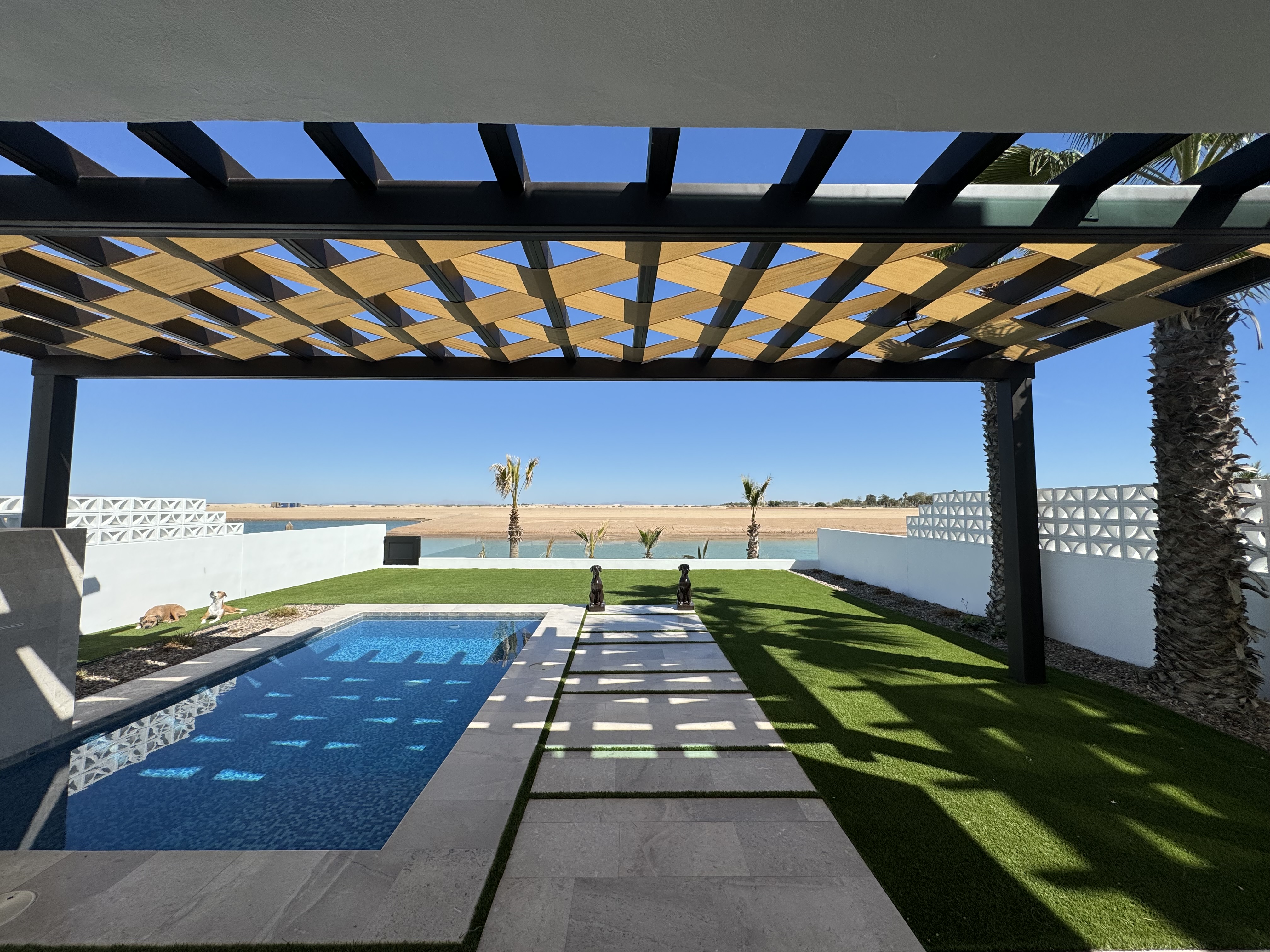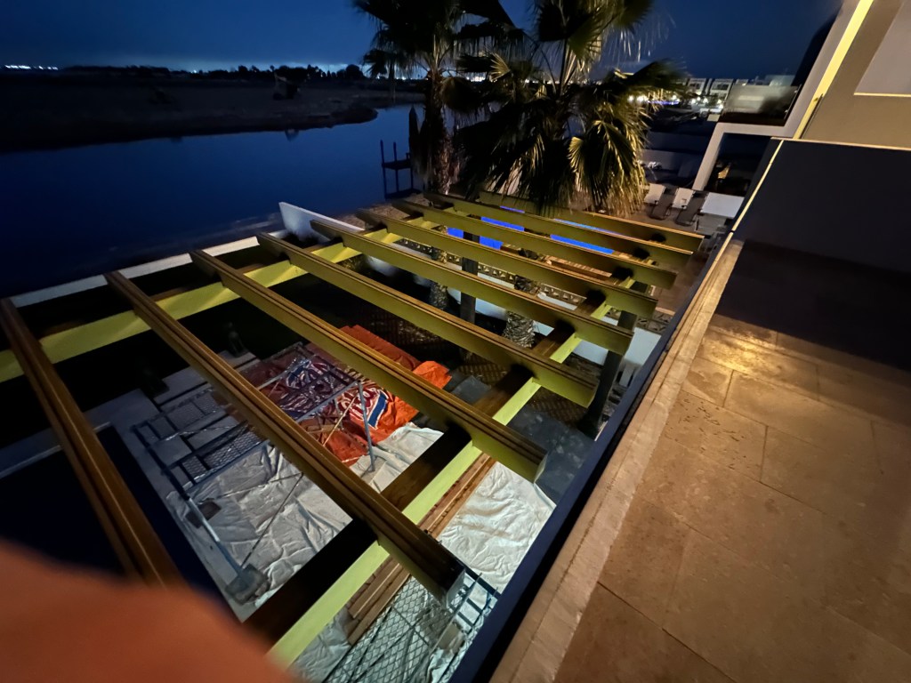 The house has come a long way, we swapped our sitting room and bedroom and added a new door making our room a true primary suite. We really like it and it fits how we live and use our space. We are finally wrapping up our outdoor projects, the pergolas have shade cloth and fans are getting installed. The next is having the patio around the pool treated with acid to make it less slippery when wet.
