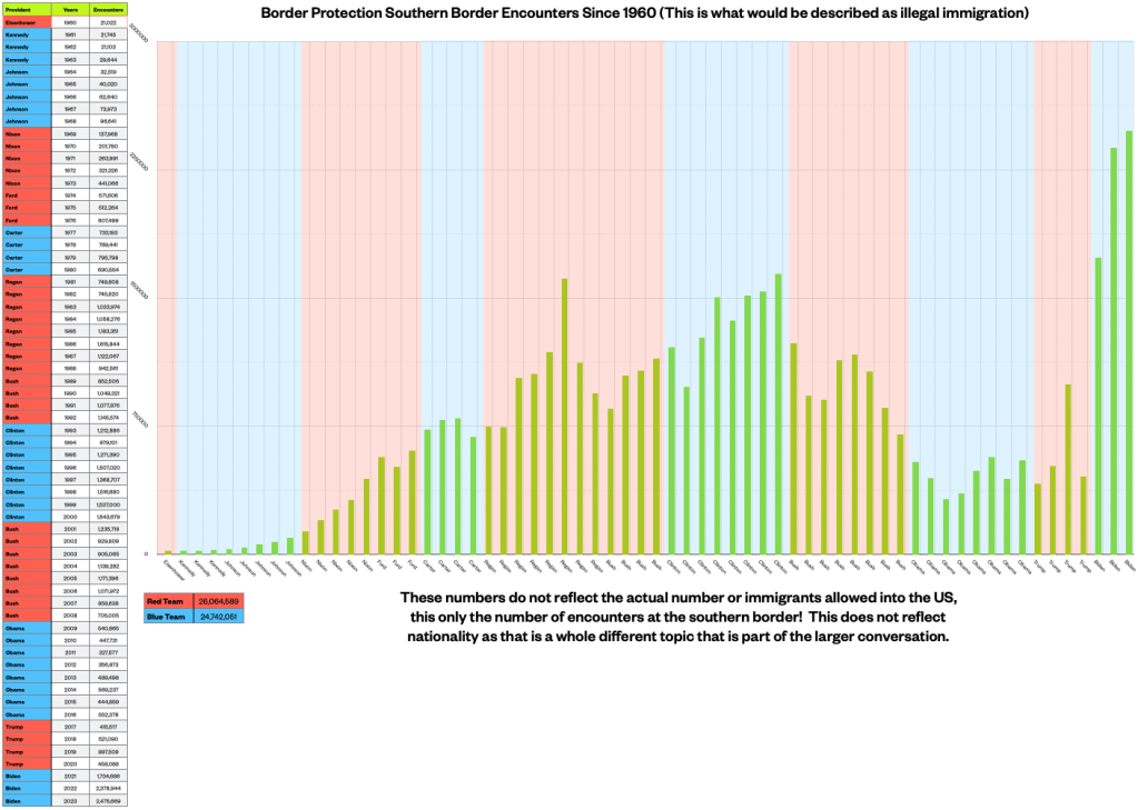 What I found out is that I was basically right.. immigration really doesn’t change much between the red and blue teams, in fact what the number suggest is that prior to the new blue team captain the red team was “winning?” by almost 8million more immigrant encounters! So I guess you could say, maybe the new blue team captain wanted to even the score? Not sure.. My point is all the rhetoric is just that! Politicians use this issue as nothing more than division to garner votes and win elections and then go back to ignoring the issue till the next news cycle, election time, etc.
