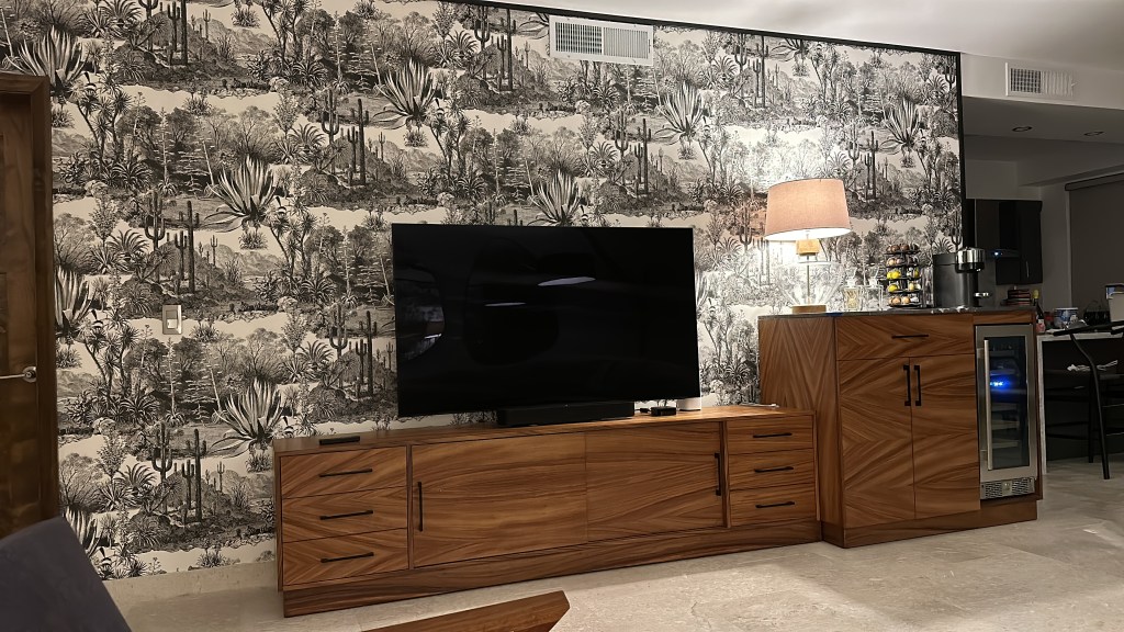 I designed two pieces of furniture for house a bar / beverage area and a storage cabinet for dishes and cooking items we don’t use often. I also designed a new armoire for our primary bedroom, to hold a new fireplace and additional clothing. I know sounds like a strange combination but again it works for us. (haha)